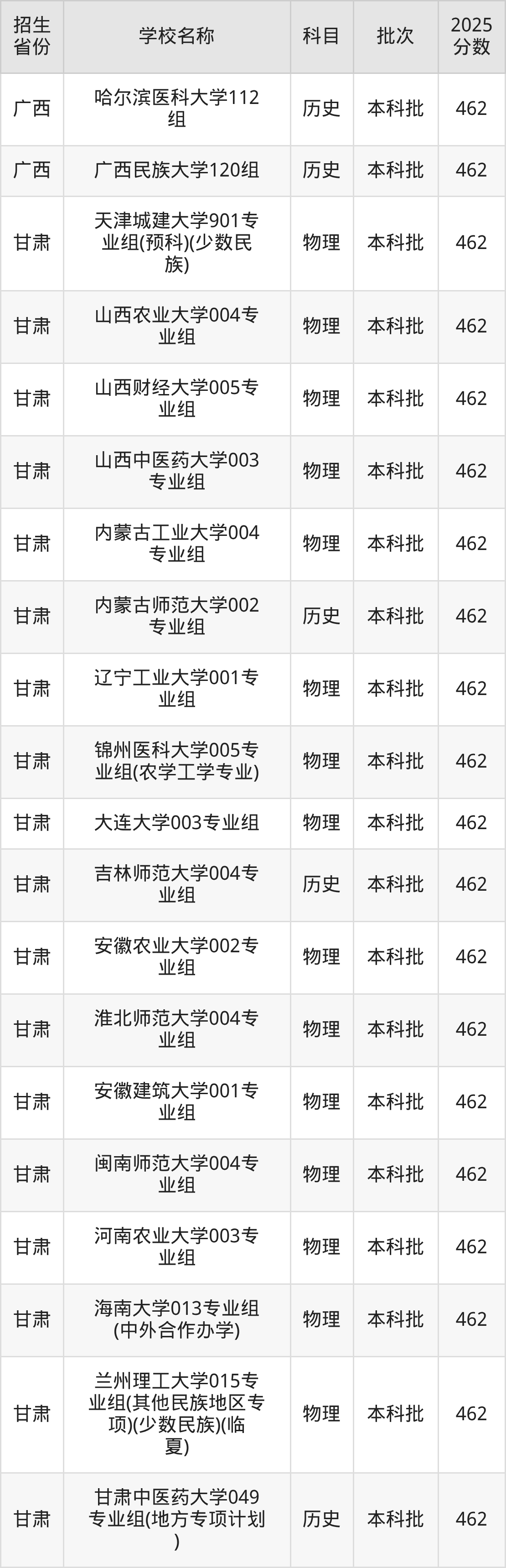 二、各省462分的一本大学名单1.甘肃高考