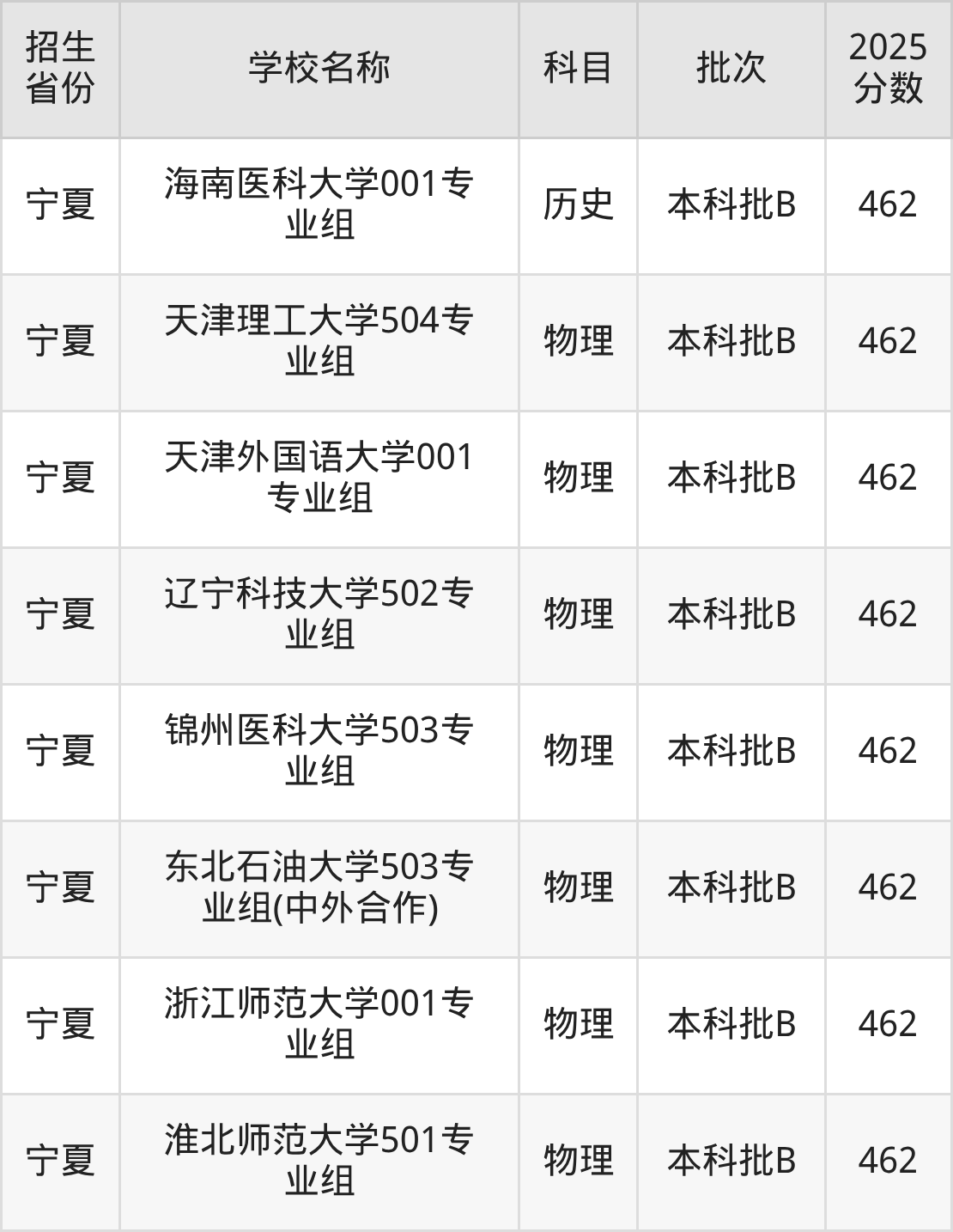 宁夏回族自治区历史组分数线是462分的一本大学有:海南医科大学。