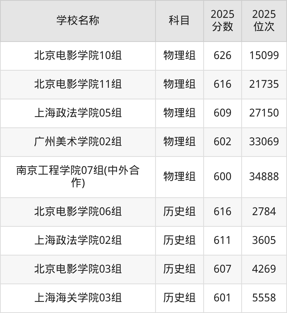 江苏高考历史组共有3所二本公办大学在600到630分之间录取,包含北京电影学院、上海政法学院、上海海关学院。