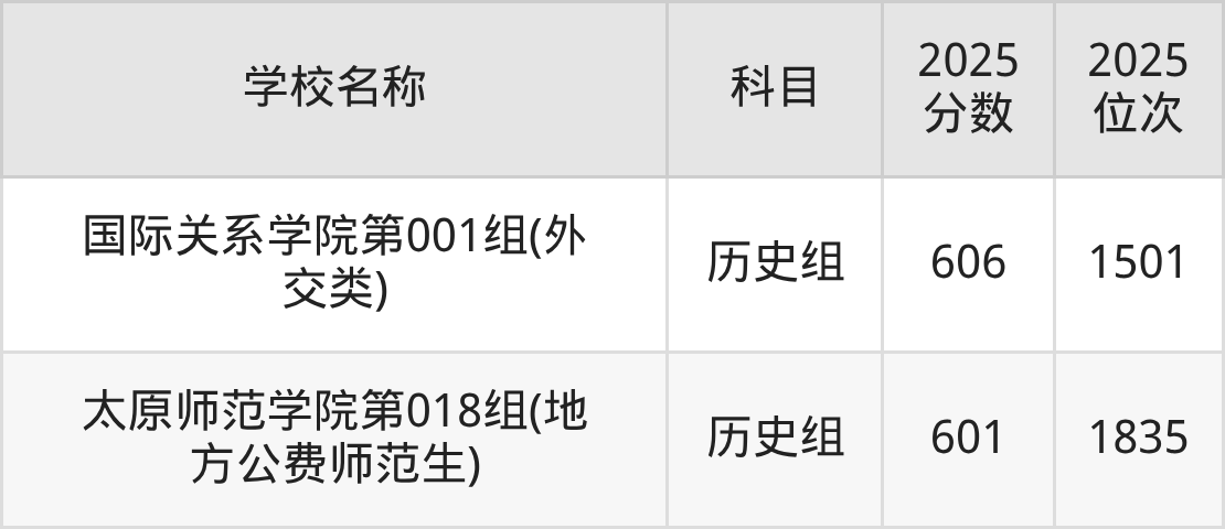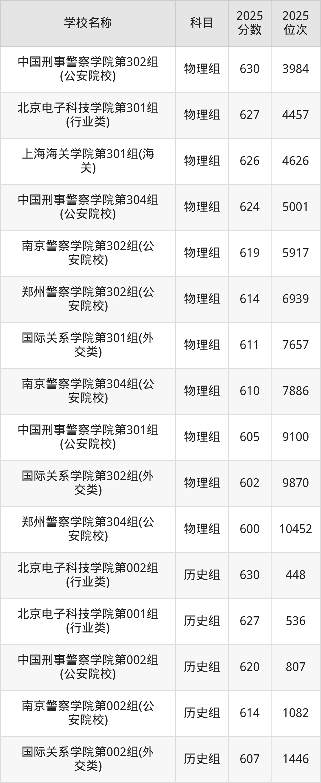 山西高考历史组共有5所二本公办大学在600到630分之间录取,包含北京电子科技学院、中国刑事警察学院、南京警察学院、国际关系学院、太原师范学院。