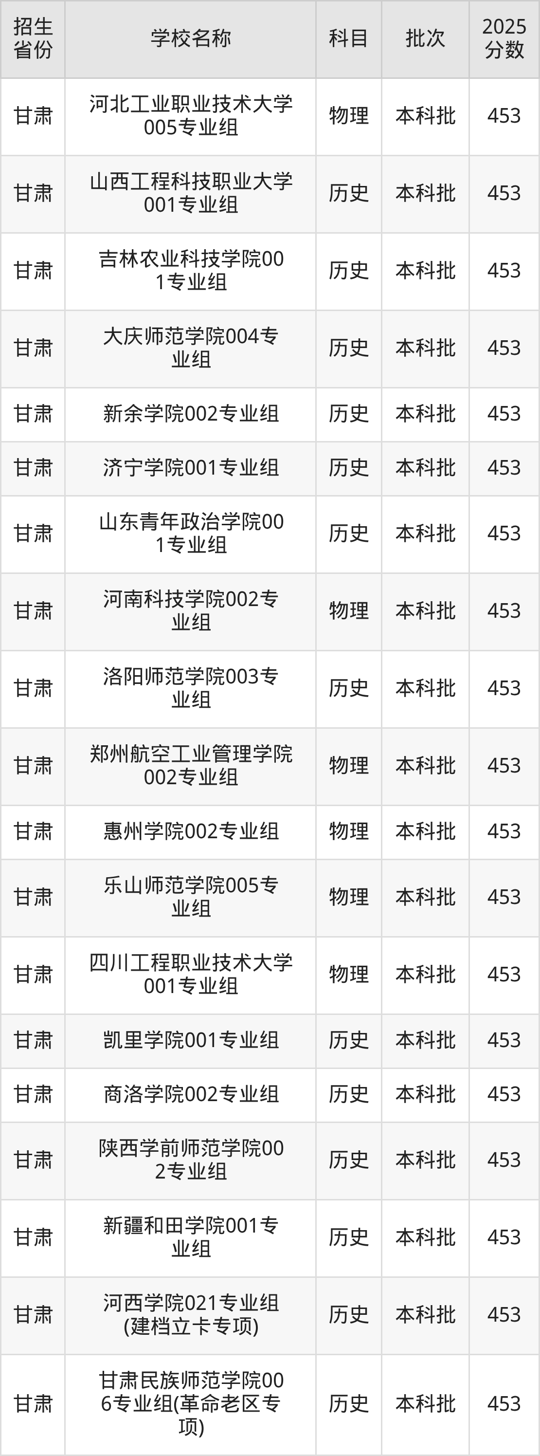 甘肃省历史组分数线是453分的二本公办大学有:山西工程科技职业大学、吉林农业科技学院、大庆师范学院、新余学院、济宁学院、山东青年政治学院、洛阳师范学院、凯里学院、商洛学院、陕西学前师范学院。