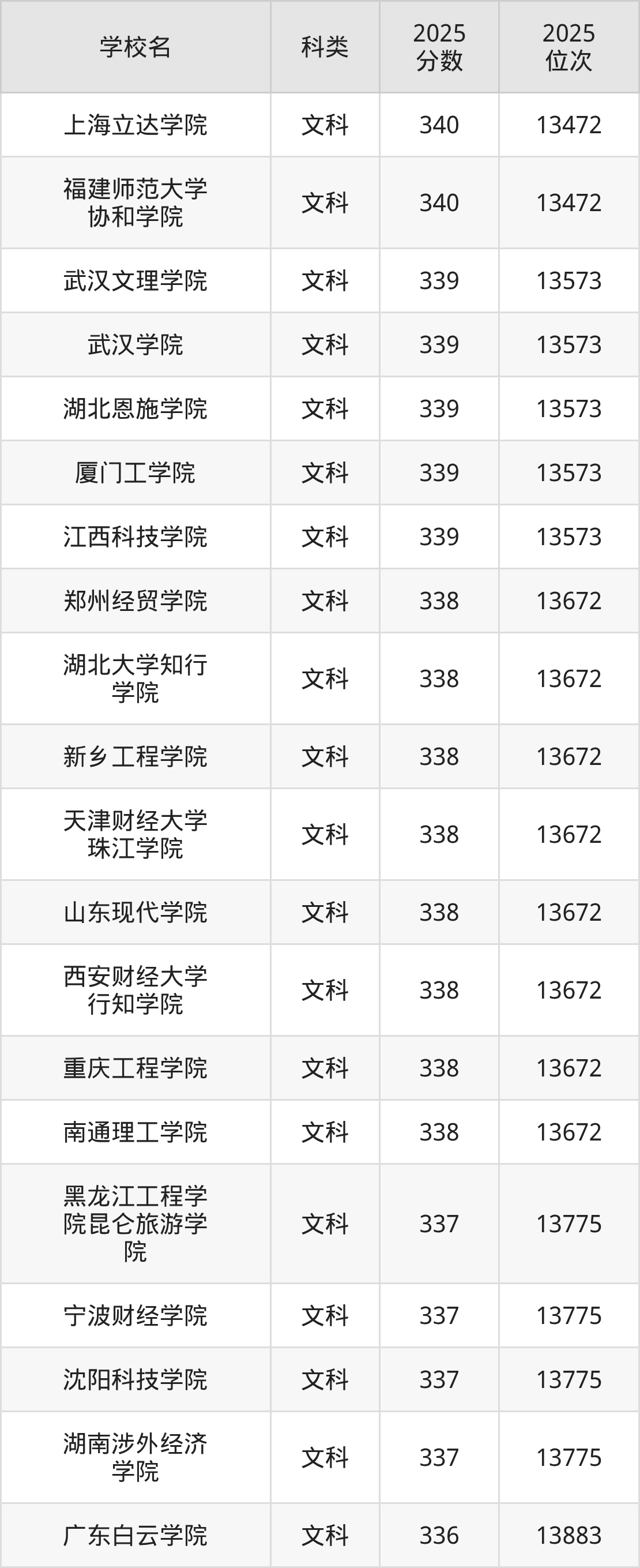 一、新疆340分能上的二本大学排名表2025年新疆文科二本线为330分,340分能上的二本大学共计120所,其中公办大学录取位次排名最低的是萍乡学院(330分),其2025最低位次为14519名。