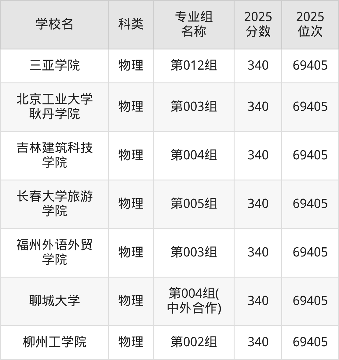2025年吉林物理类本科线为340分,压线能上的二本大学共计7所,对应大学最低位次排名为69405名。公办大学有聊城大学。民办大学有三亚学院、北京工业大学耿丹学院、吉林建筑科技学院、长春大学旅游学院等。