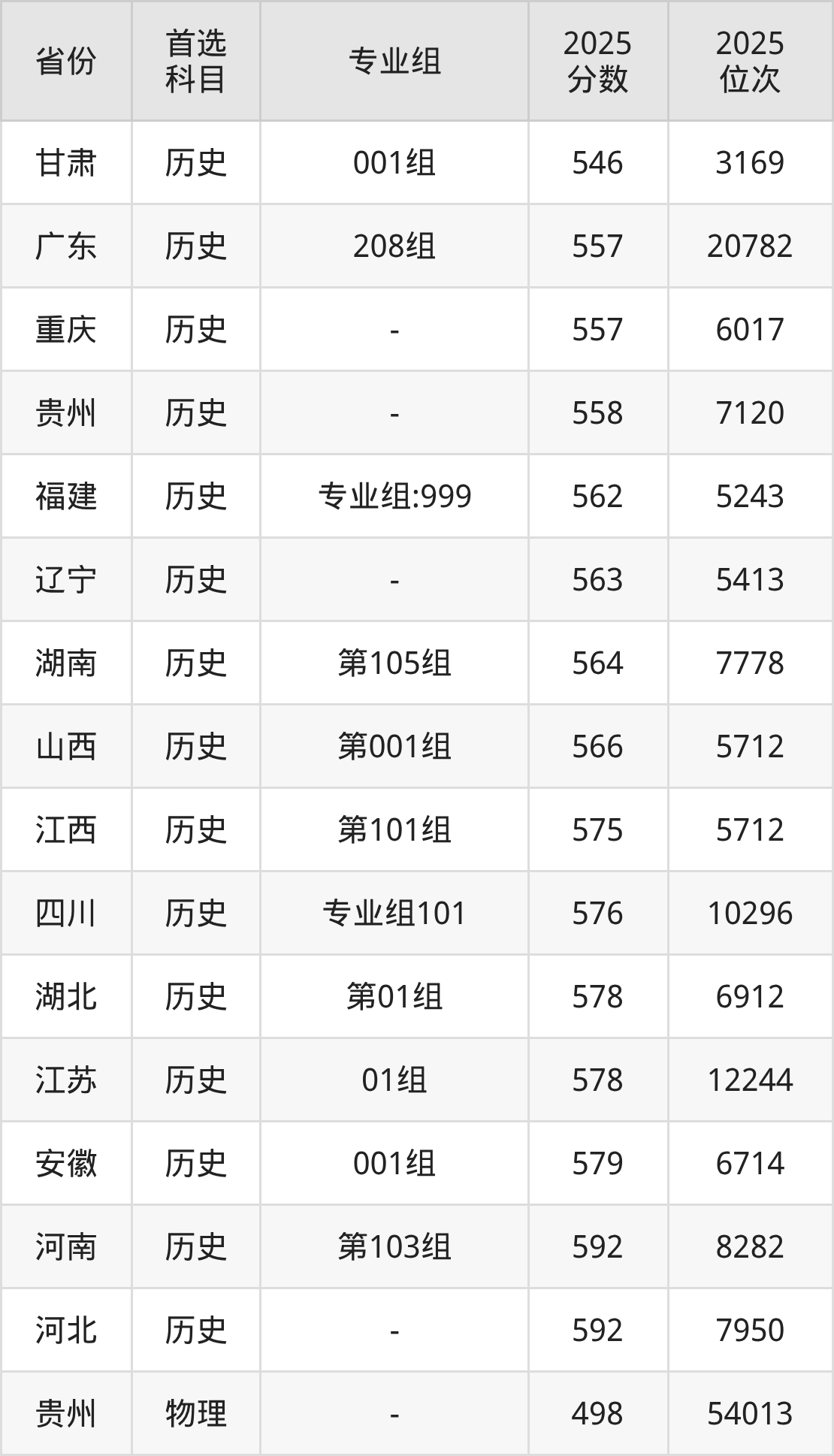 历史类最低分对应地区为甘肃(001组),录取位次为3169,超本科线134分;最高分对应地区为河北,录取位次为7950,超本科线115分。