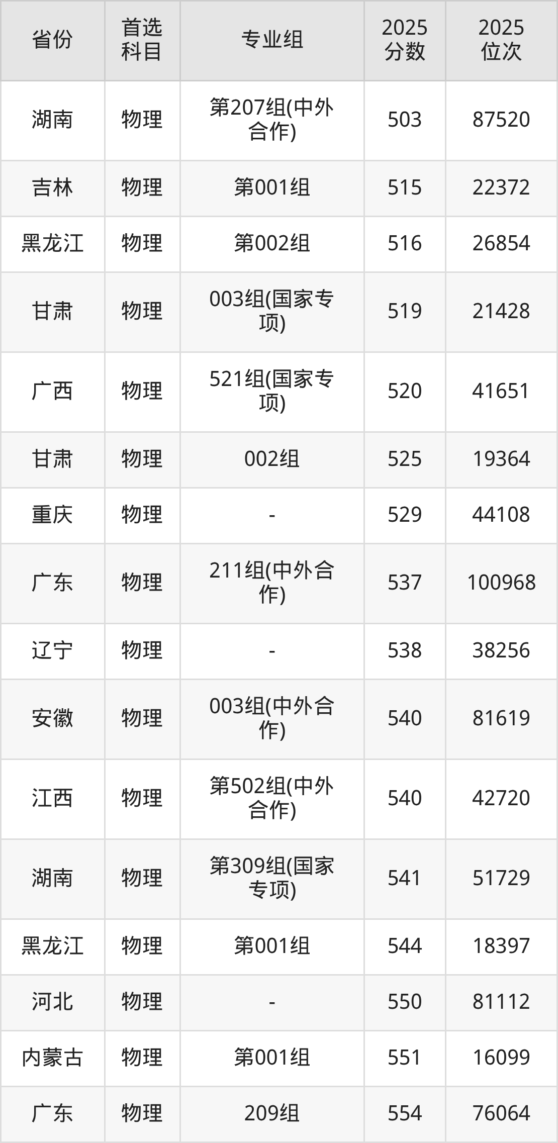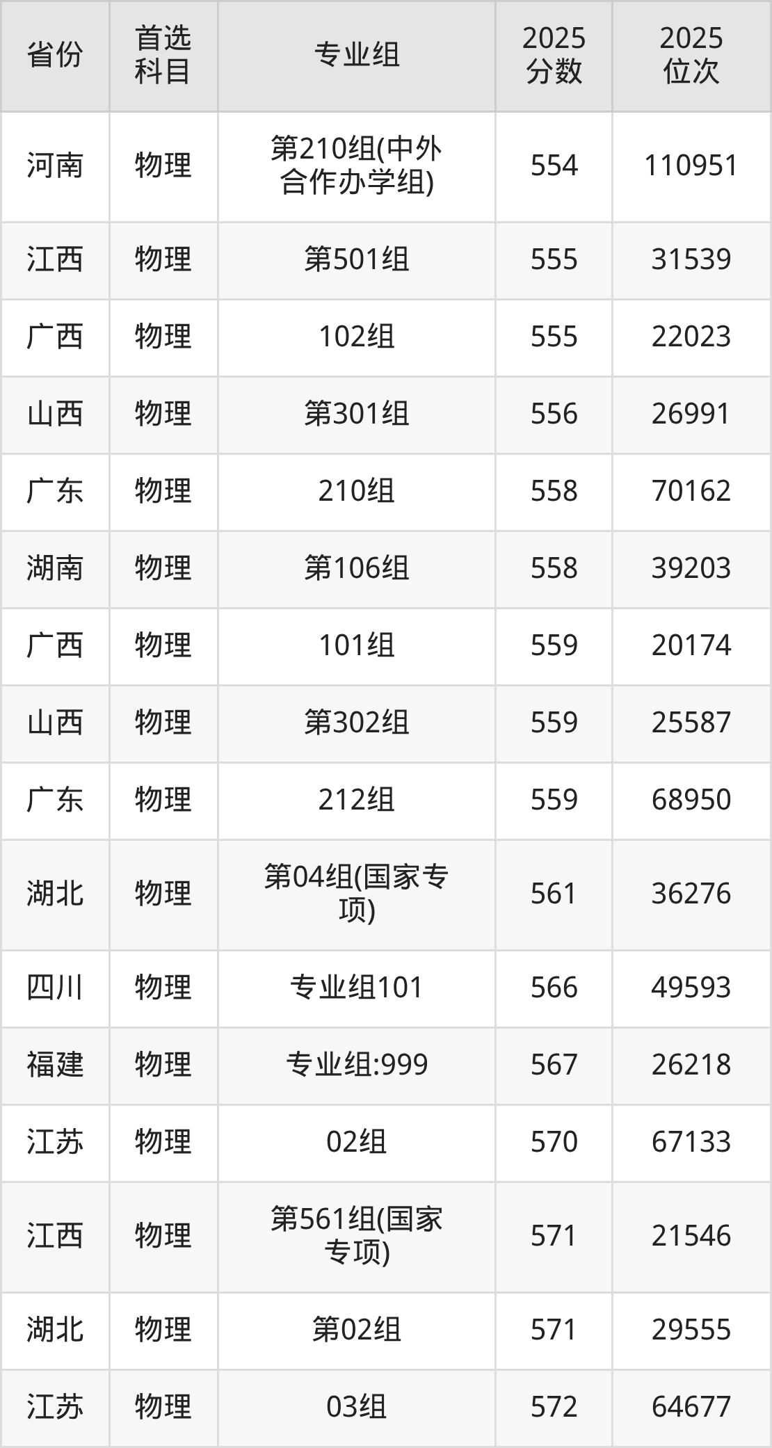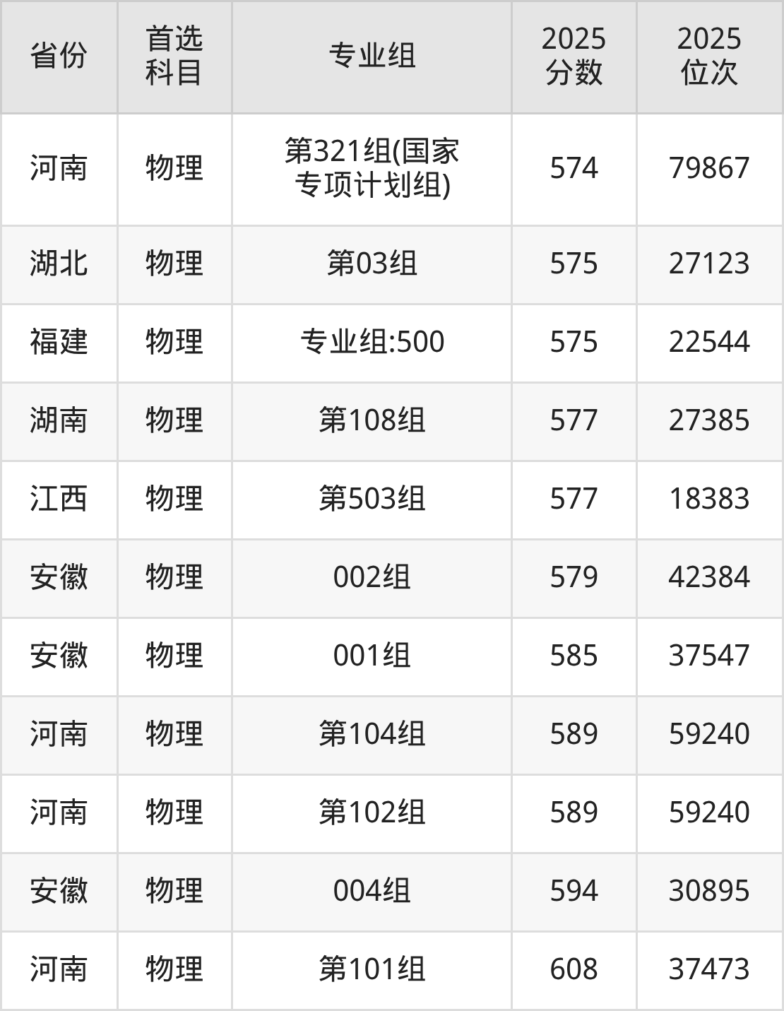 物理类最低分对应地区为贵州,录取位次为54013,超本科线124分;最高分对应地区为河南(第101组),录取位次为37473,超本科线181分。