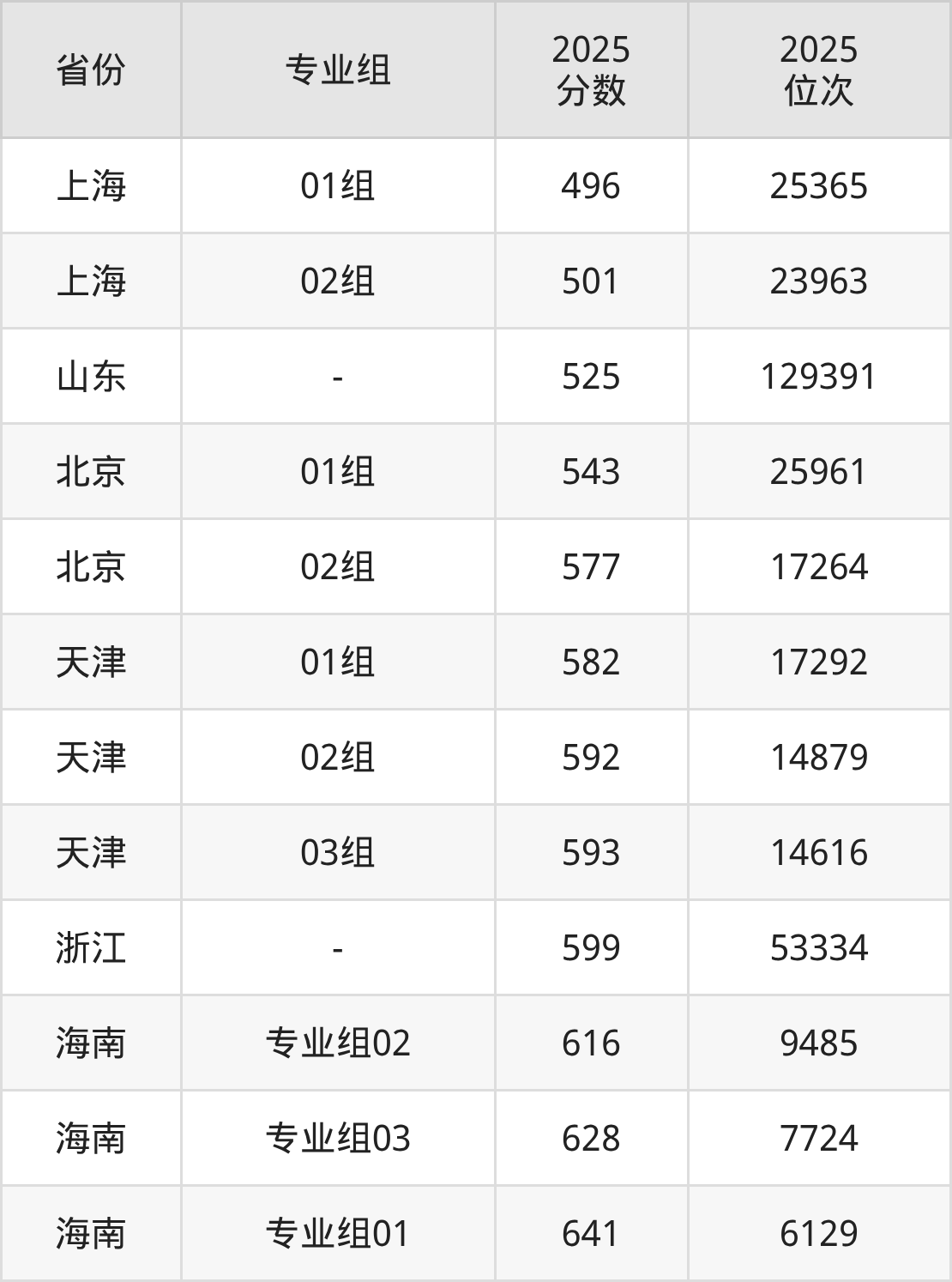 最低分对应地区为上海(01组),录取位次为25365,超本科线94分;最高分对应地区为海南(专业组01),录取位次为6129,超本科线161分。