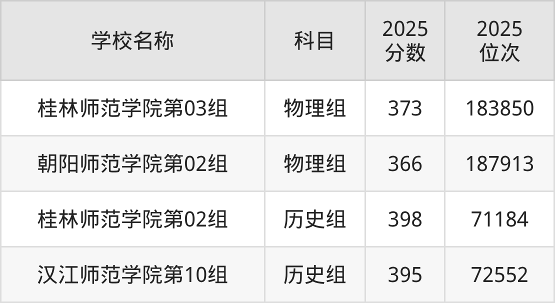 湖北高考历史组共有2所二本师范大学在350到420分之间录取,包含桂林师范学院、汉江师范学院。