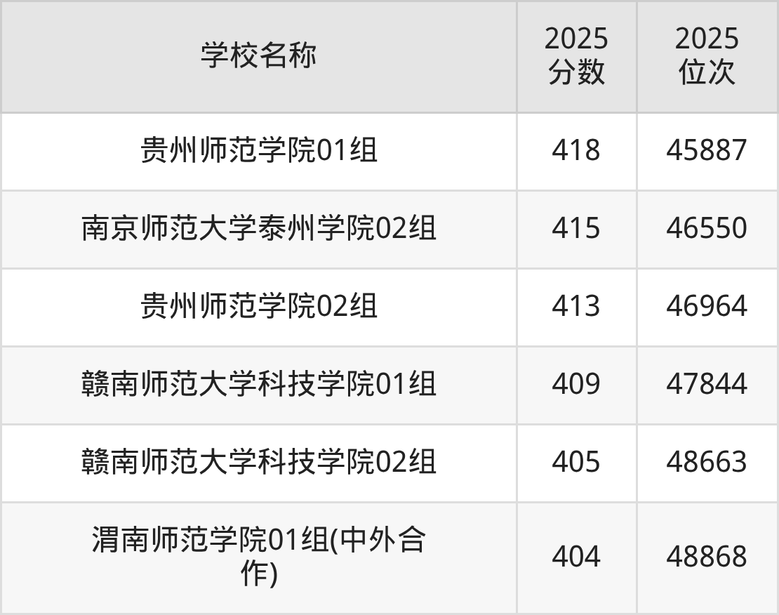 上海高考共有4所二本师范大学在350到420分之间录取,包含贵州师范学院、南京师范大学泰州学院、赣南师范大学科技学院、渭南师范学院。
