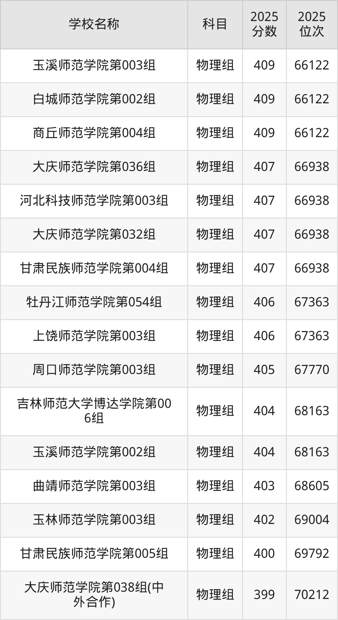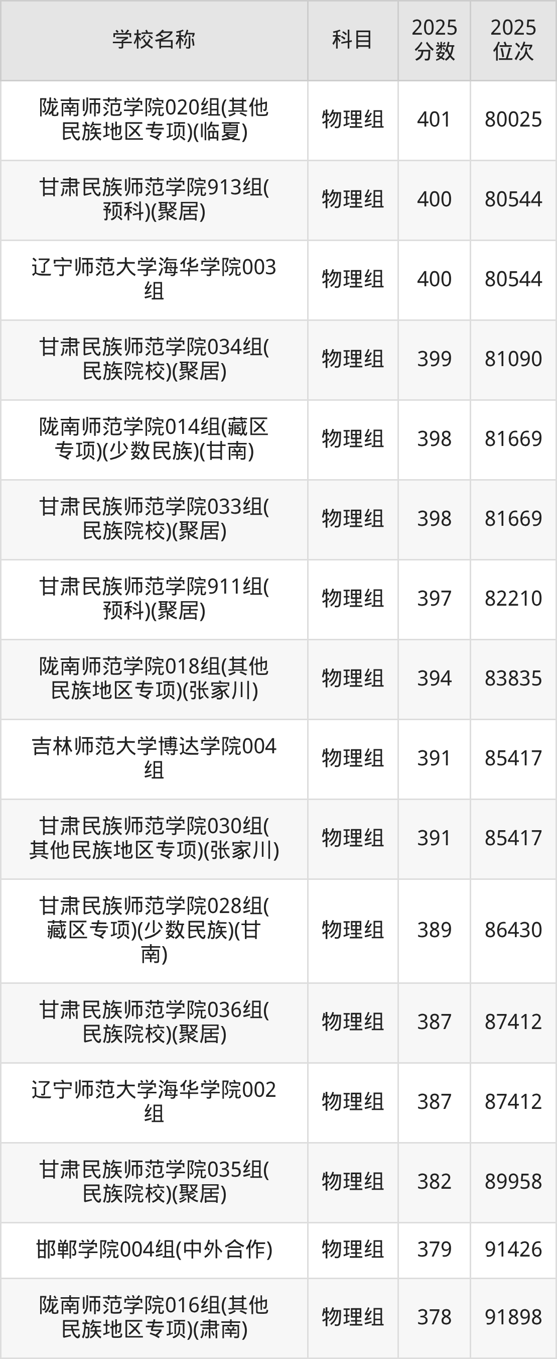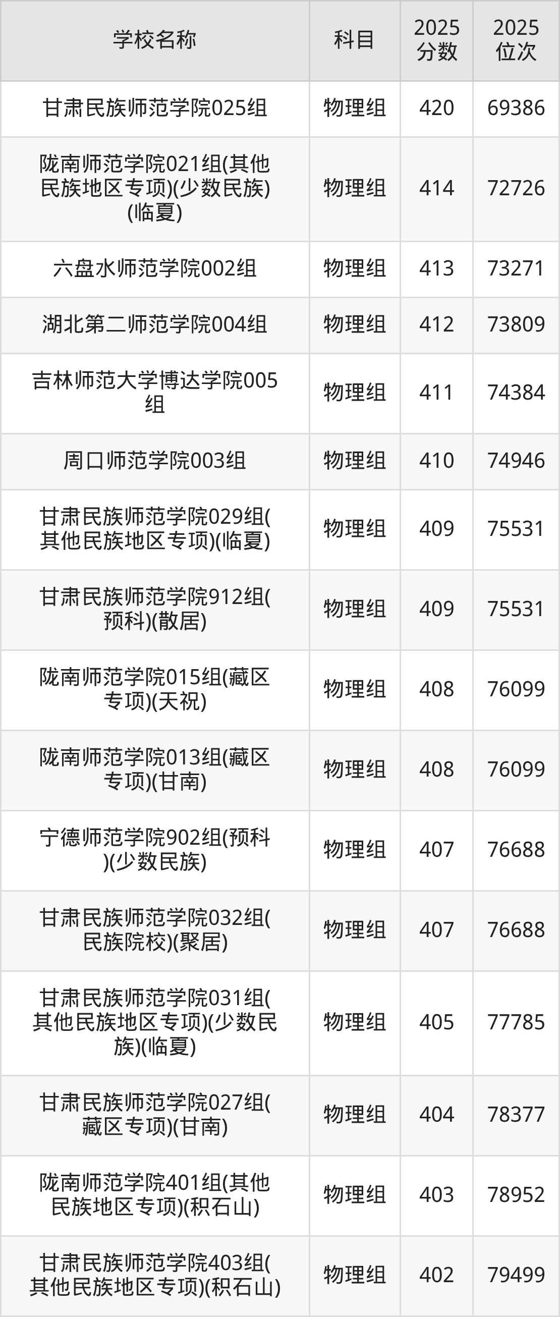 甘肃高考物理组共有11所二本师范大学在350到420分之间录取,包含甘肃民族师范学院、陇南师范学院、六盘水师范学院、湖北第二师范学院、吉林师范大学博达学院、周口师范学院、宁德师范学院、辽宁师范大学海华学院、朝阳师范学院、汉江师范学院。