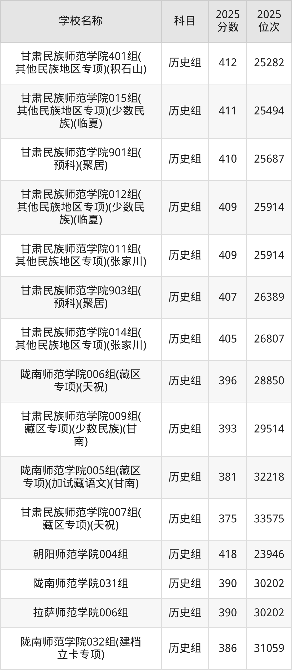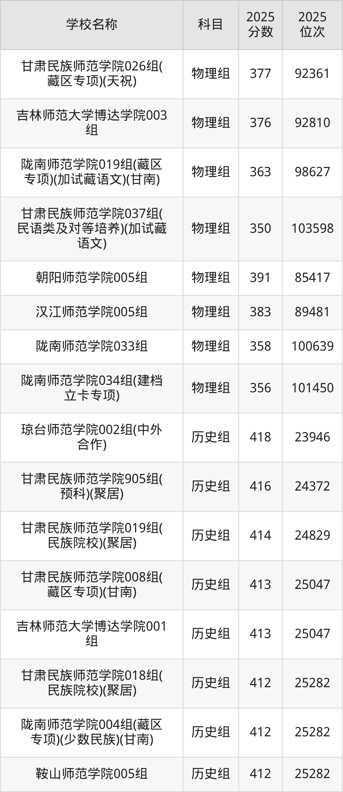 甘肃高考历史组共有7所二本师范大学在350到420分之间录取,包含琼台师范学院、朝阳师范学院、甘肃民族师范学院、吉林师范大学博达学院、鞍山师范学院、陇南师范学院、拉萨师范学院。