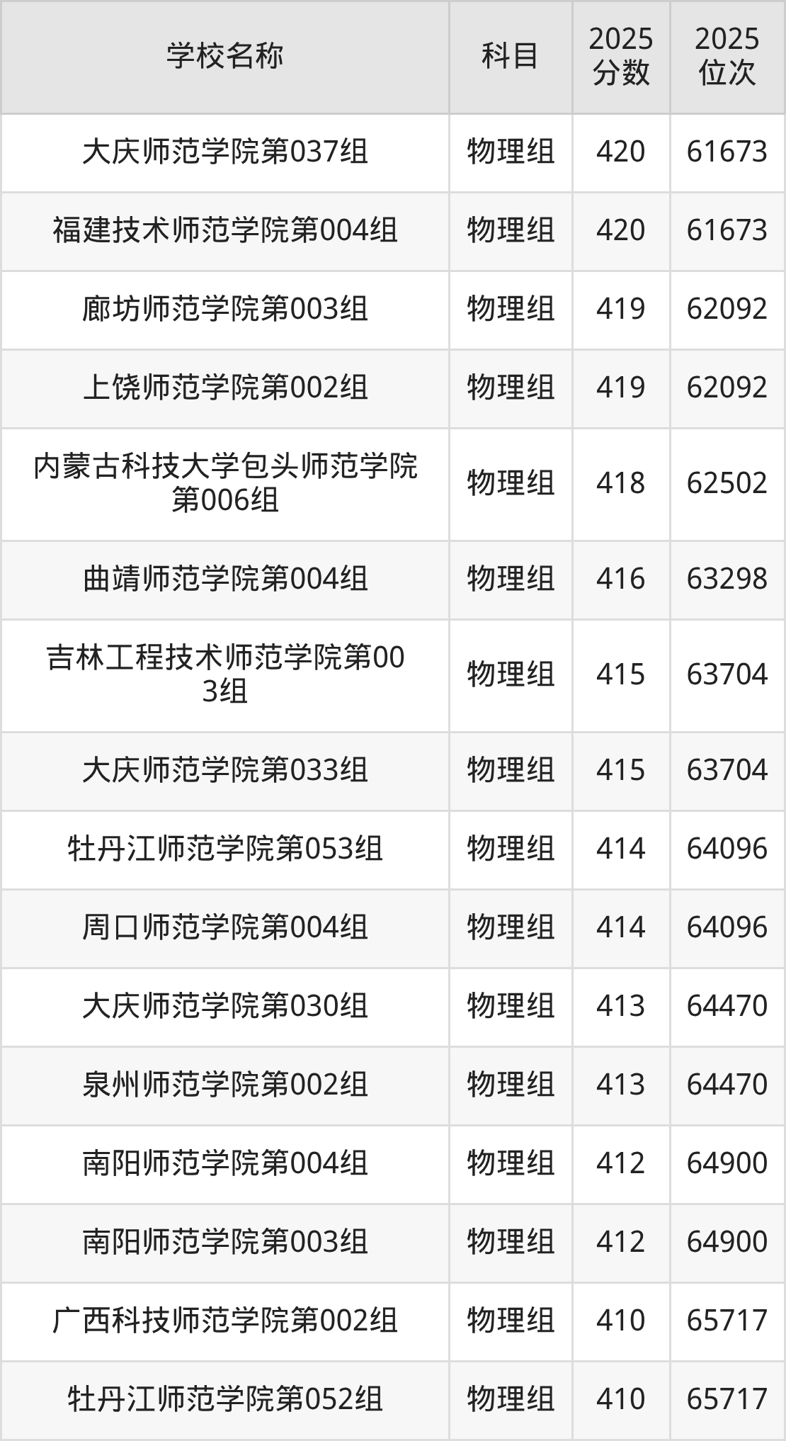 黑龙江高考物理组共有26所二本师范大学在350到420分之间录取,包含大庆师范学院、福建技术师范学院、廊坊师范学院、上饶师范学院、内蒙古科技大学包头师范学院、曲靖师范学院、吉林工程技术师范学院、牡丹江师范学院、周口师范学院、泉州师范学院。