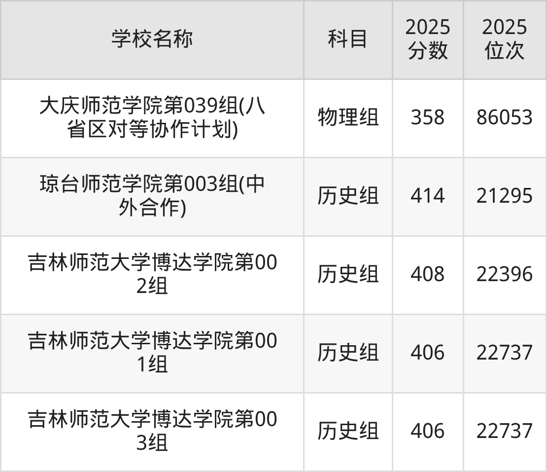 黑龙江高考历史组共有2所二本师范大学在350到420分之间录取,包含琼台师范学院、吉林师范大学博达学院。