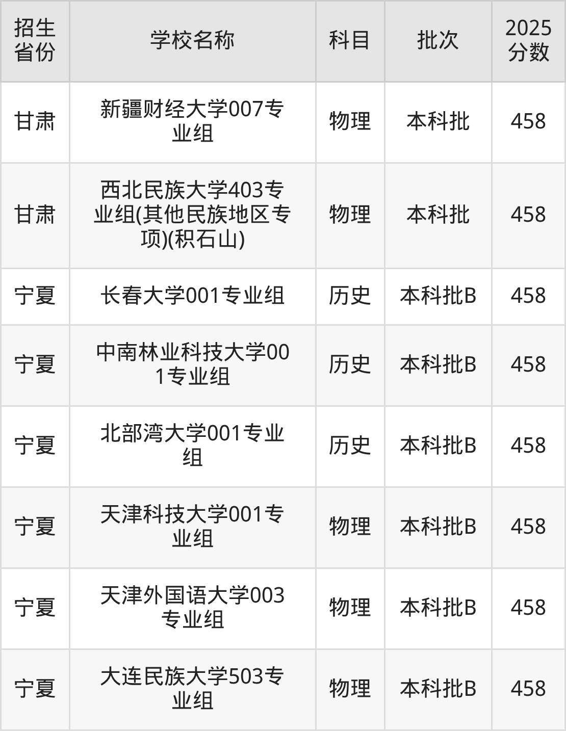 宁夏回族自治区历史组分数线是458分的一本大学有:长春大学、中南林业科技大学、北部湾大学。
