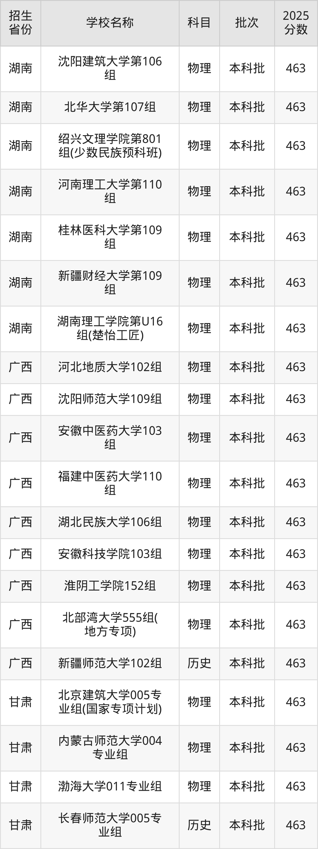 甘肃省物理组分数线是463分的一本大学有:北京建筑大学、内蒙古师范大学、渤海大学、哈尔滨师范大学、湖州师范大学、绍兴大学、吉首大学、北部湾大学、云南农业大学、西南林业大学。