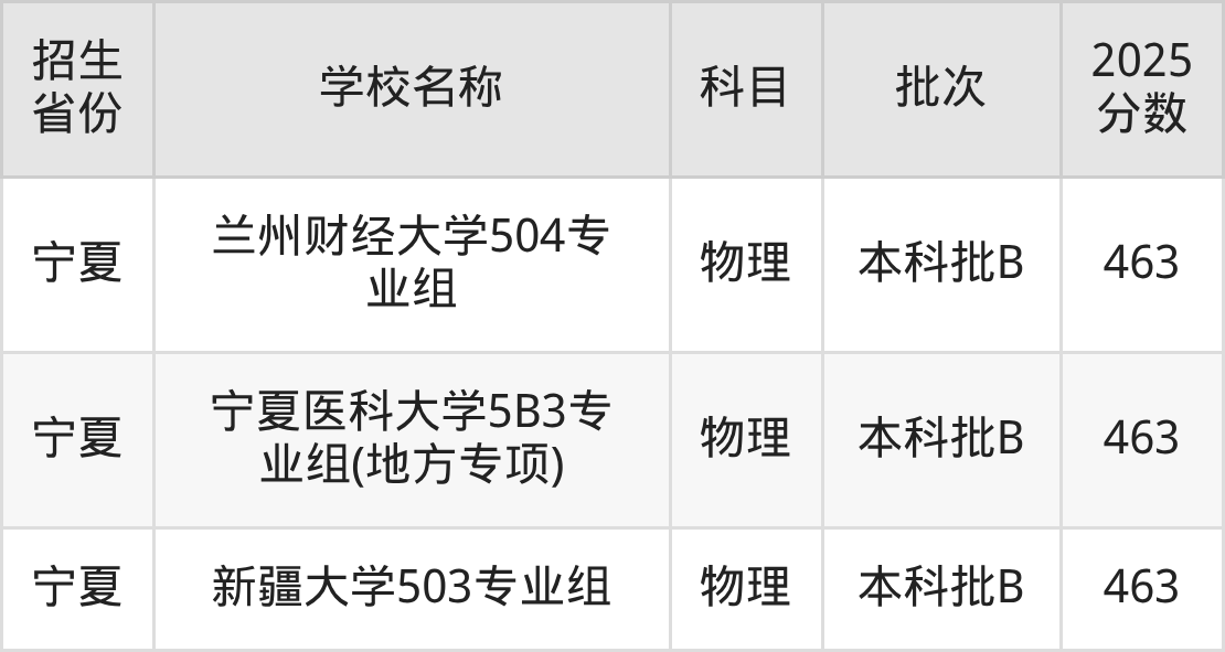 宁夏回族自治区物理组分数线是463分的一本大学有:天津科技大学、天津商业大学、安徽农业大学、湖南科技大学、兰州财经大学、宁夏医科大学、新疆大学。