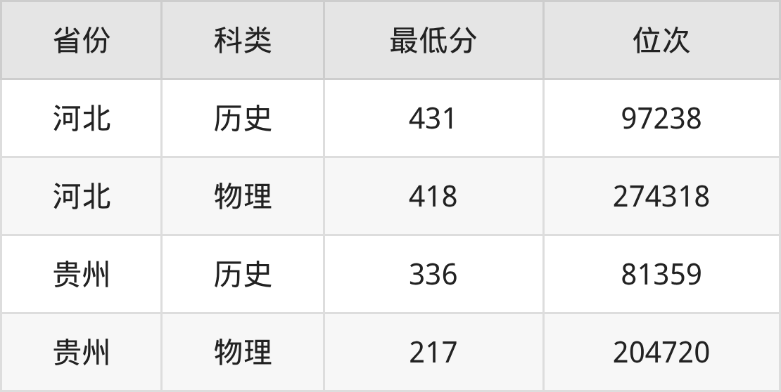2025年保定职业技术学院视觉传达设计专业在贵州录取最低分:历史组是336分,对应位次排名是81359名;物理组是217分,对应位次排名是204720名。