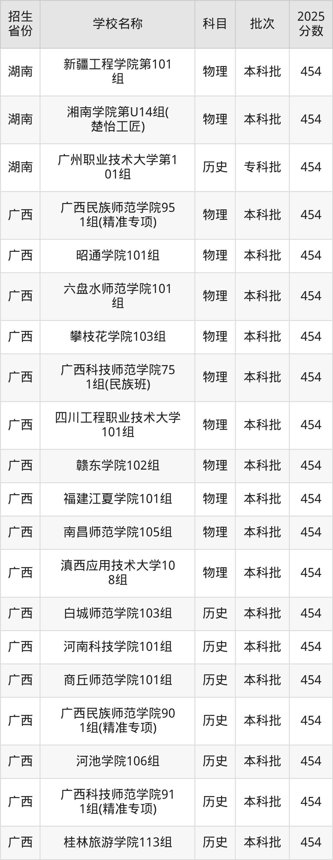广西壮族自治区历史组分数线是454分的二本公办大学有:白城师范学院、河南科技学院、商丘师范学院、广西民族师范学院、河池学院、广西科技师范学院、桂林旅游学院、贺州学院、山西传媒学院、兰州石化职业技术大学。