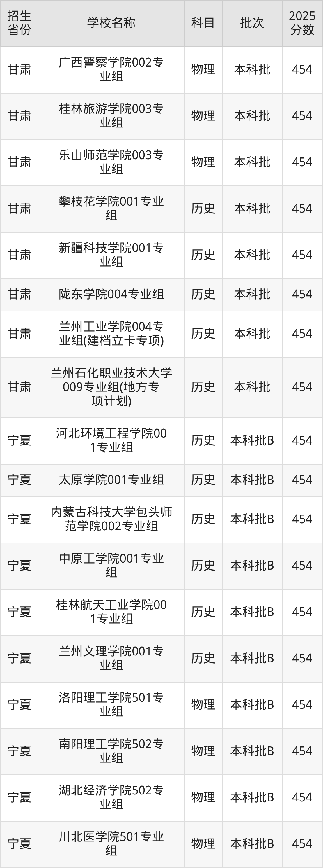 宁夏回族自治区历史组分数线是454分的二本公办大学有:河北环境工程学院、太原学院、内蒙古科技大学包头师范学院、中原工学院、桂林航天工业学院、兰州文理学院。