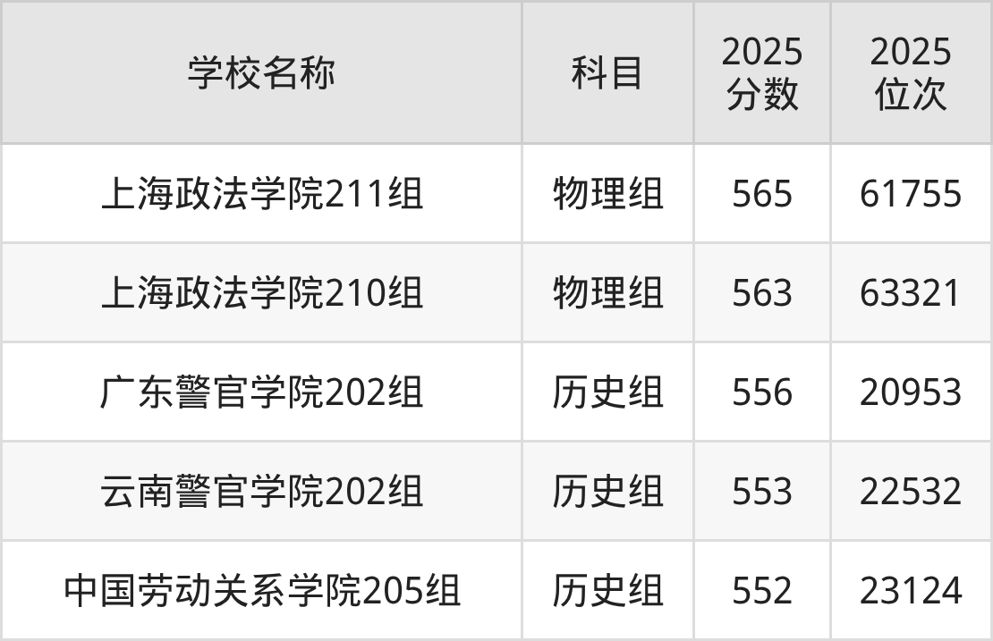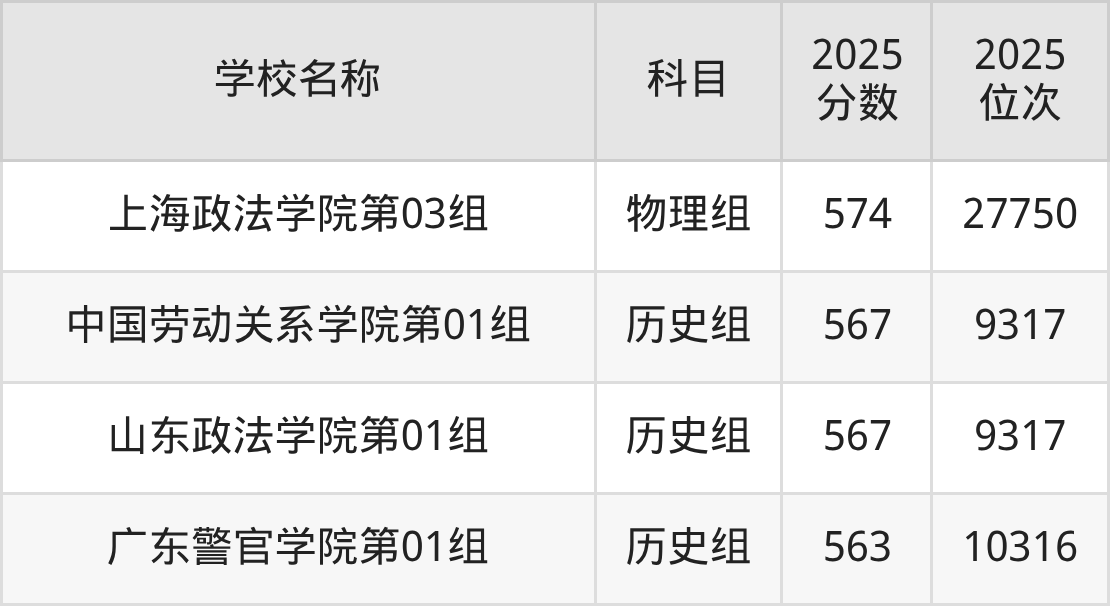 广东高考历史组共有3所二本政法大学在550到580分之间录取,包含广东警官学院、云南警官学院、中国劳动关系学院。