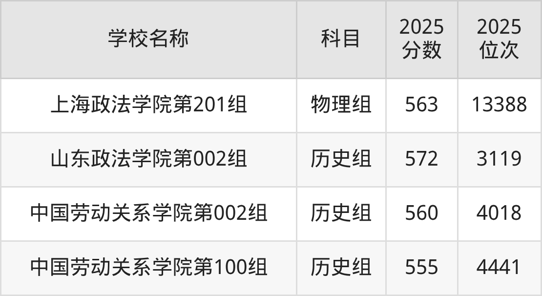 湖北高考历史组共有3所二本政法大学在550到580分之间录取,包含中国劳动关系学院、山东政法学院、广东警官学院。