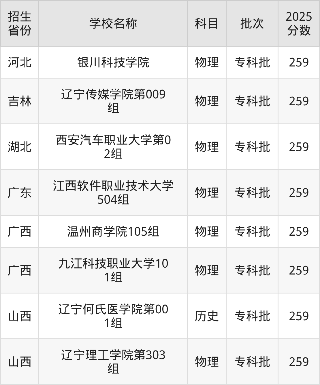 一、259分能上什么大学筛选全国各省2025年录取分数线为259分的二本民办大学如下: